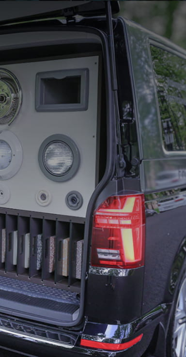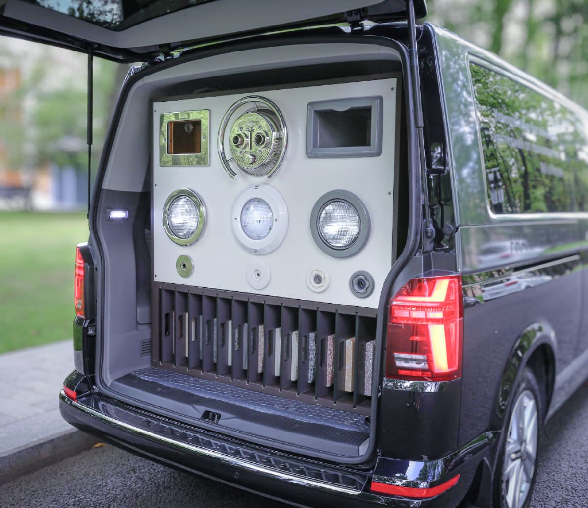 • В мобильном офисе представлены образцы покрытий и оборудования — можно сразу выбрать понравившееся.
