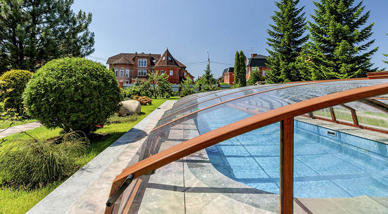 Хотите продлить купальный сезон для Вашего уличного бассейна с ранней весны до поздней осени — воспользуйтесь современной телескопической конструкцией из алюминия и оргстекла. Павильон можно сдвигать в теплую солнечную погоду и возвращать обратно в холодную и дождливую. Он не боится ветров и снегопадов и хорошо защищает Ваш бассейн от любых загрязнений. Вы можете выбрать недорогие низкие модели или установить высокий купальный зал.